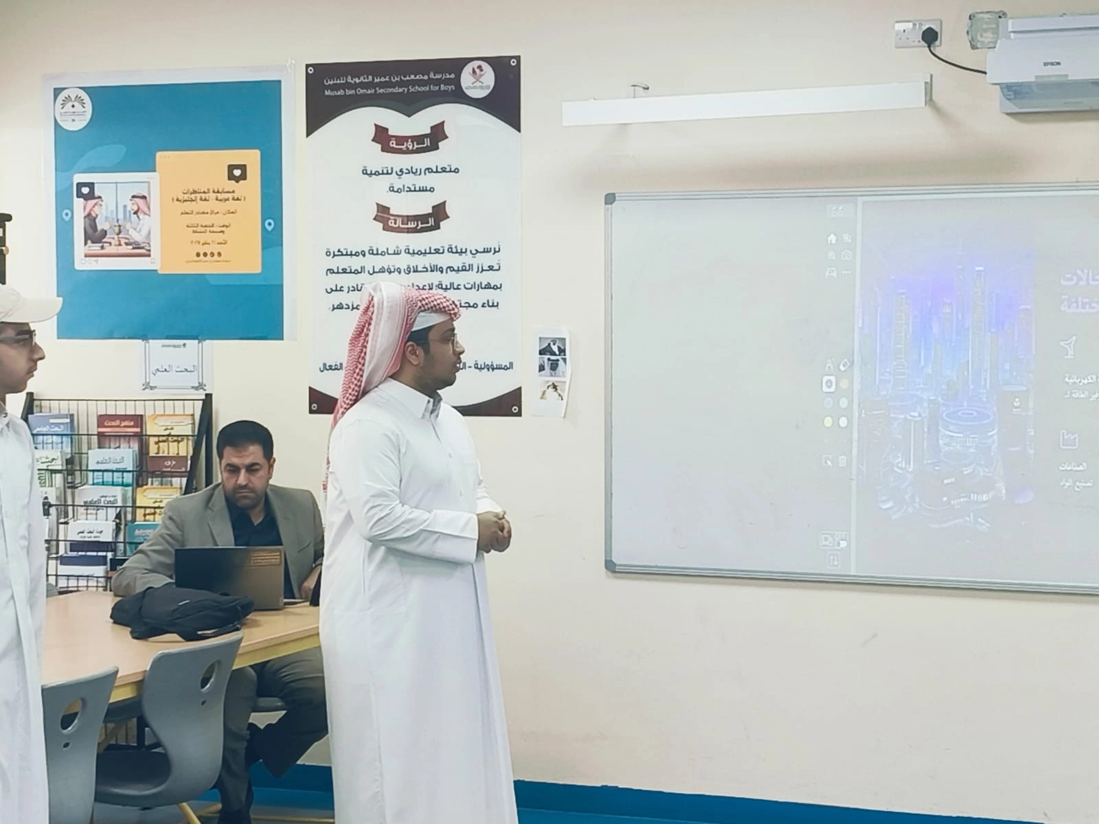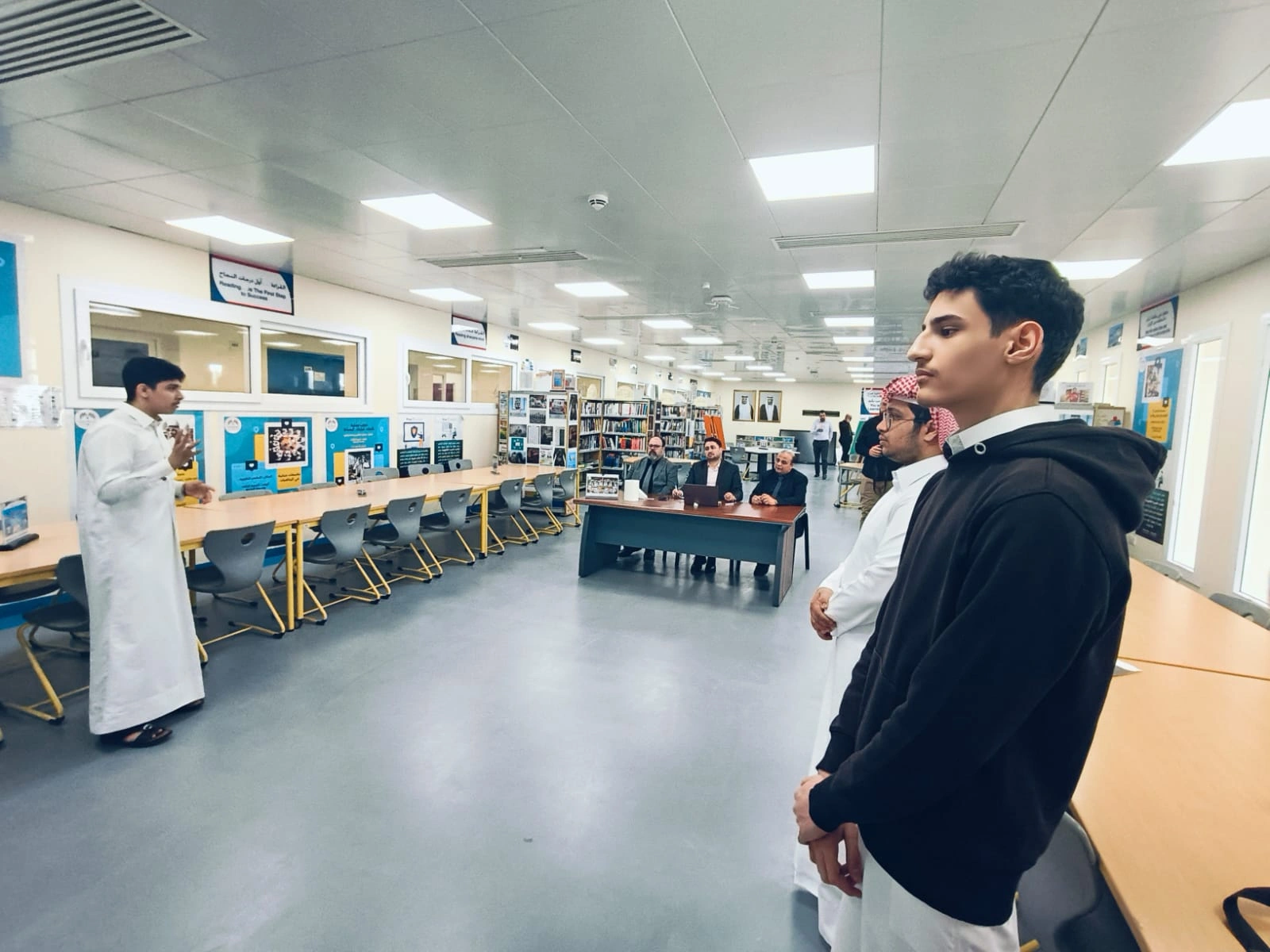 وقد أبدى مدير المدرسة الأستاذ / دخيل سالم النابت اهتمامًا بالغًا بسير مناقشات مشاريع التخرج، حيث أكد على أهمية هذه المشاريع في صقل مهارات الطلاب البحثية والتطبيقية، وإعدادهم للانتقال إلى المرحلة الجامعية بثقة واقتدار